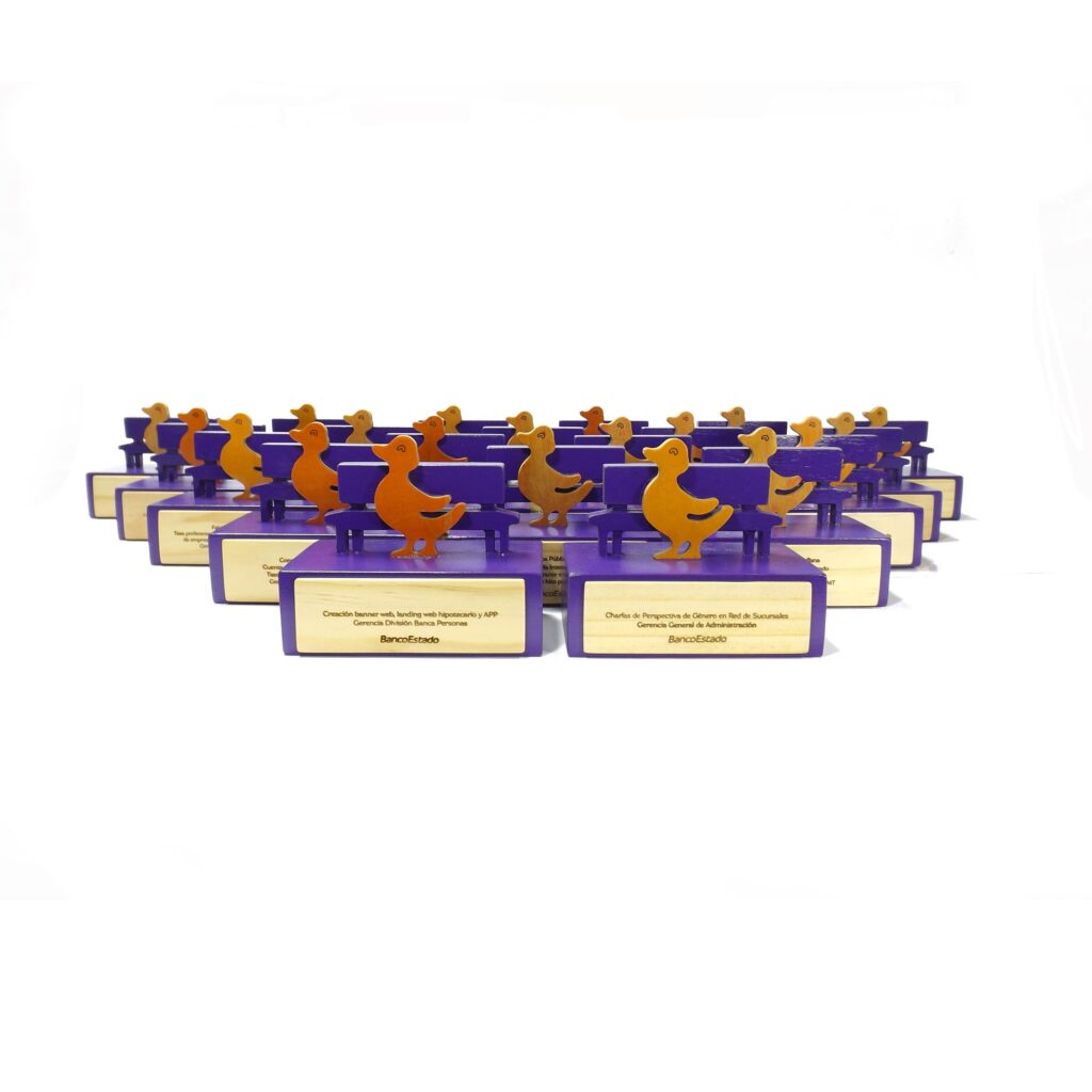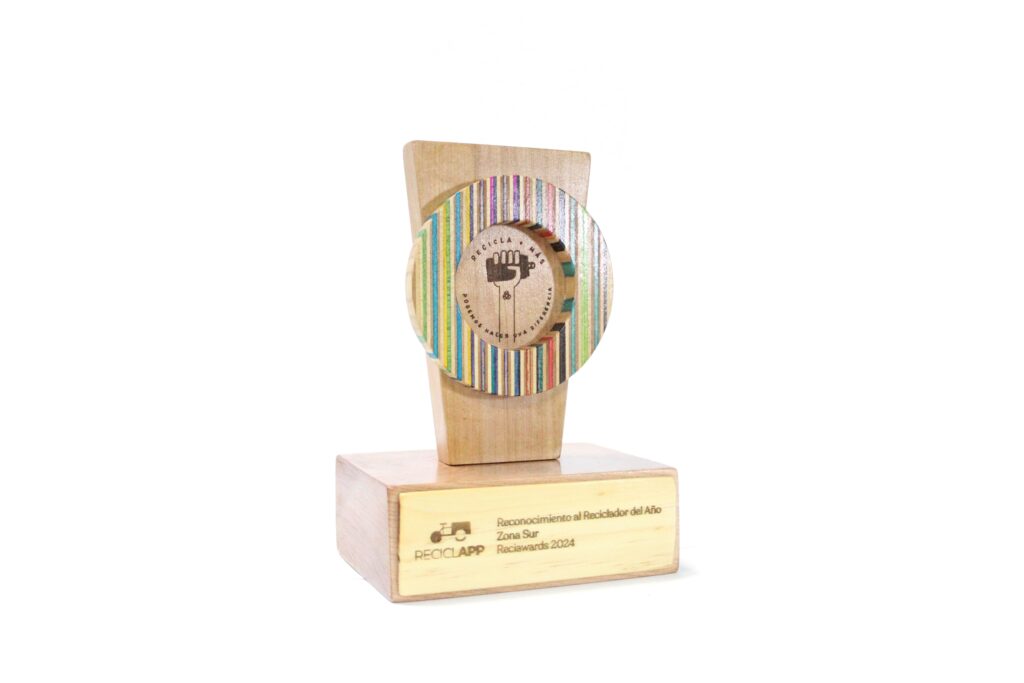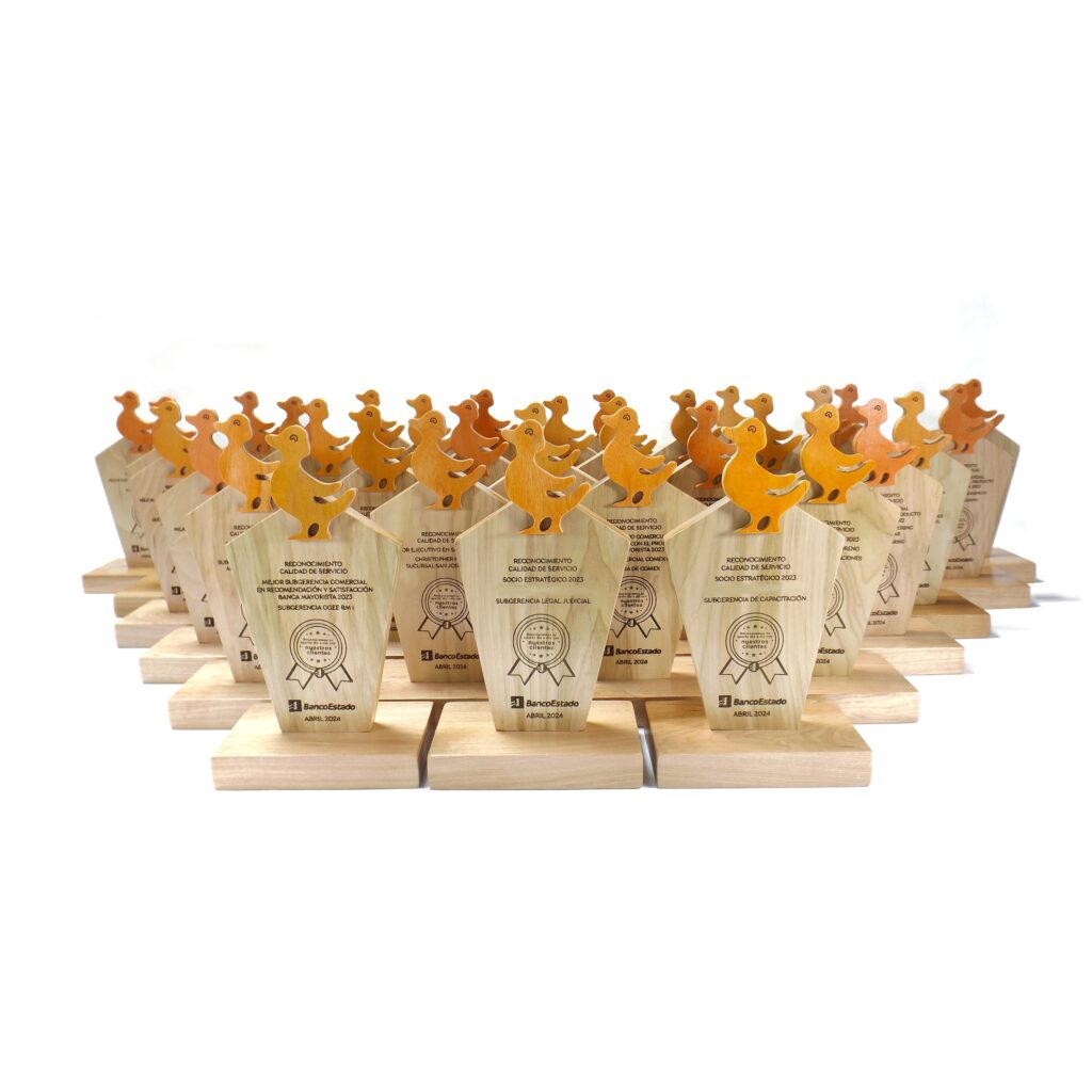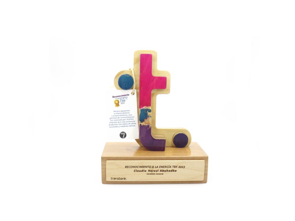 Desde 2023 hemos desarrollado una línea personalizada de galvanos para BancoEstado, diseñando y fabricando reconocimientos para diversas instancias internas y públicas. Este trabajo ha implicado la creación de más de 600 piezas únicas, todas fabricadas con madera reciclada —incluyendo tablas de skate en desuso— y terminaciones de alta calidad que reflejan la identidad visual y los valores del banco.
