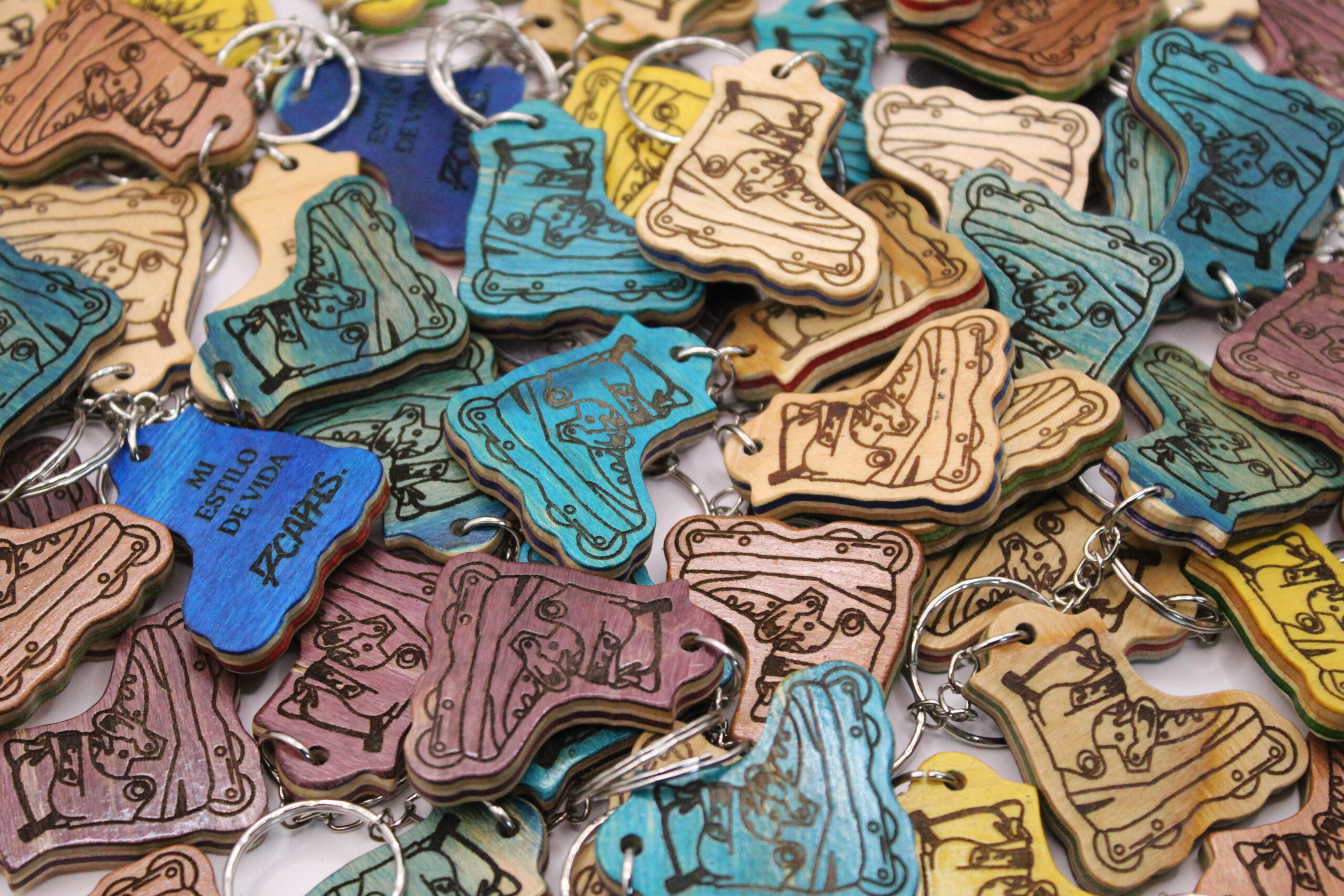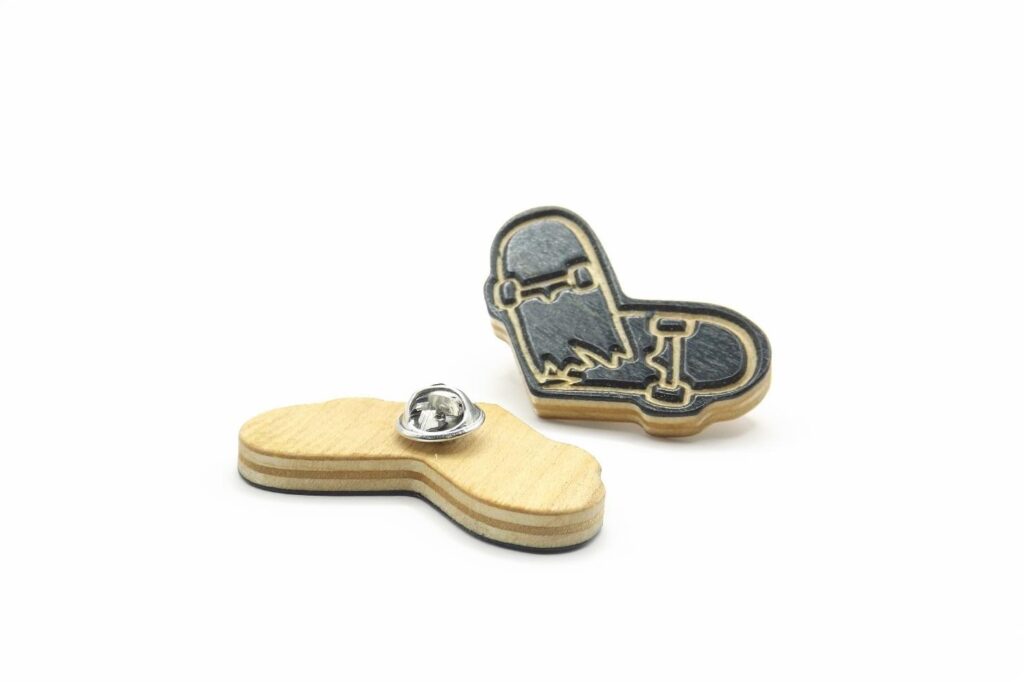 Pequeños accesorios elaborados con madera reciclada de skate, ideales para decorar mochilas, gorros o chaquetas. Cada pieza posee acabado brillante que realza su color y durabilidad.