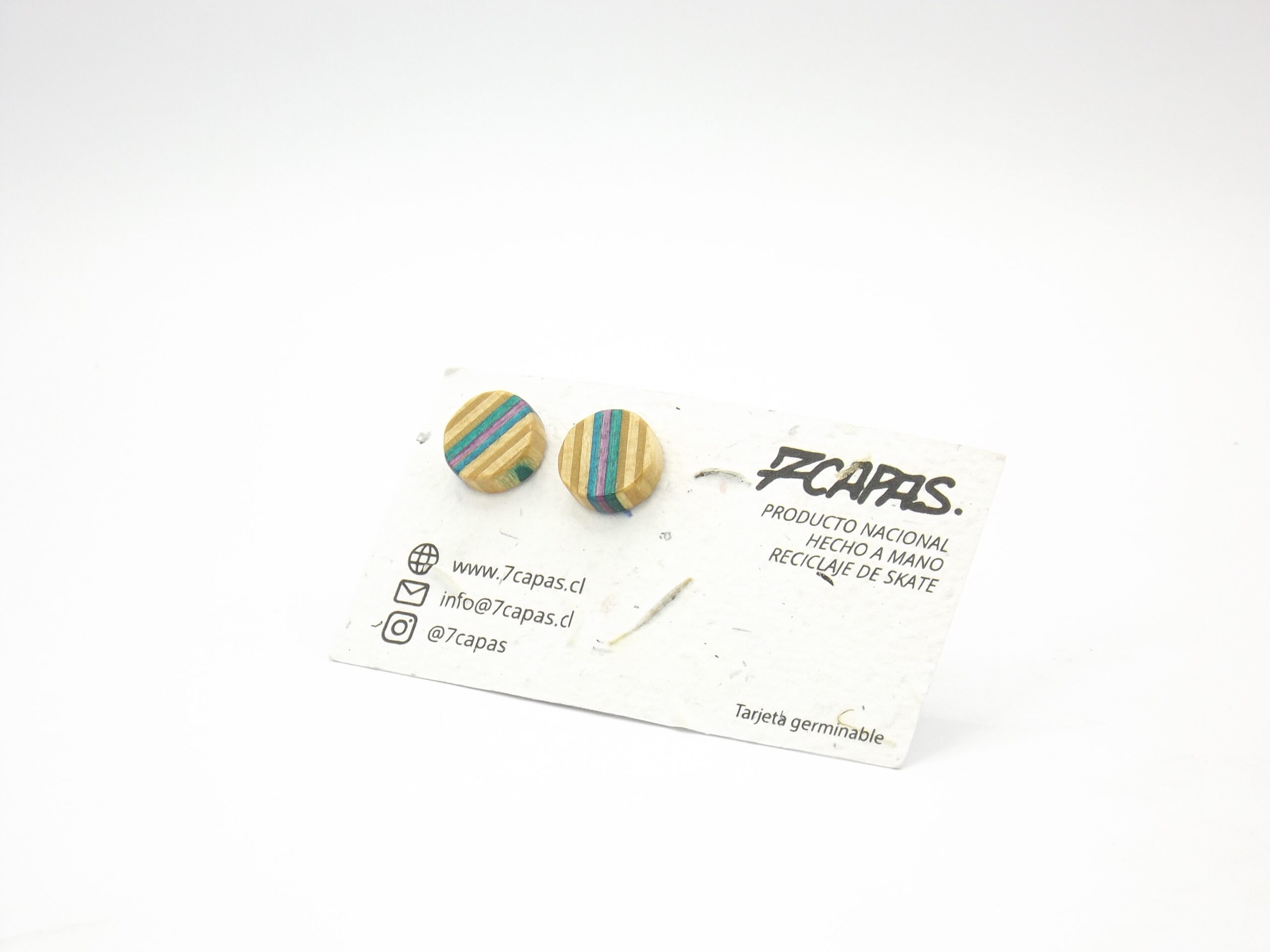 Aros de tope circulares, fabricados a partir de tablas de skate recicladas. El patrón lineal de colores que proporcionan las tablas brinda a estas piezas una estética inconfundible, asociada a la sustentabilidad de cada producto que realizamos. Los topes utilizados son de acero quirúrgico, por lo que no causan irritación en personas alérgicas.